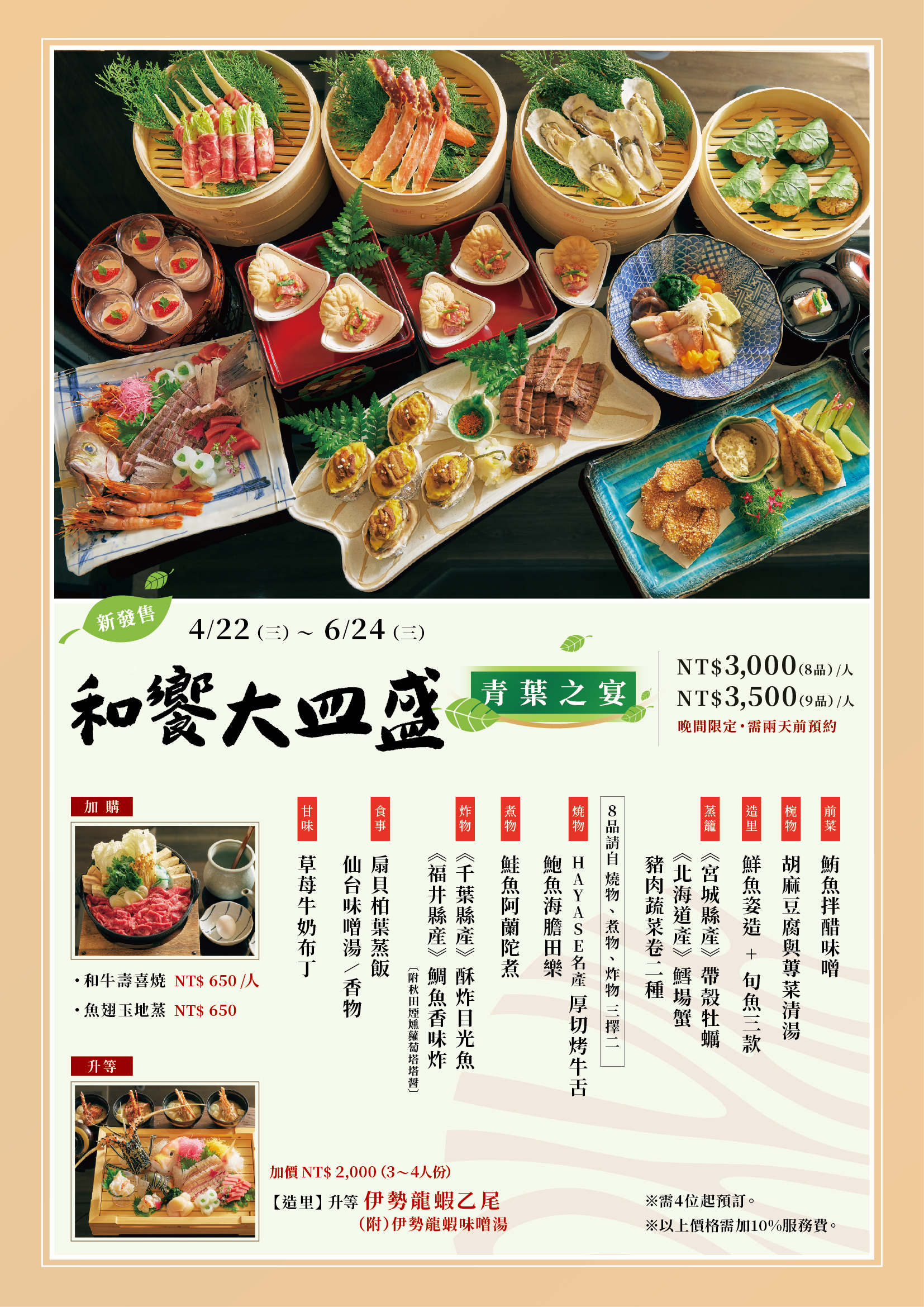 ※加價項目:升等伊勢龍蝦姿造與味噌湯須加價NT$2,000元;和牛壽喜燒加購NT$650元(每位);魚翅玉地蒸NT$650元。